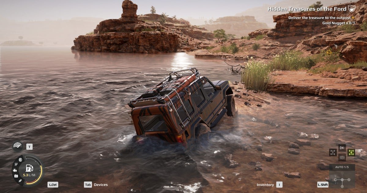 It’s surprising how quickly these driving techniques become intuitive. While Expeditions can be a challenging game, you can get around the maps easily enough just by being sensible. Always look for the smoothest route, even if it’s more circuitous. If you come to a large body of water, use your sonar to detect where it is shallowest. There’s also a fundamental sponginess to the environmental puzzling that allows you to feel out the right way up a slope or down a rocky ditch. You know when your vehicle is likely to tip over or begin to slide back down a hill, so you can adjust your approach accordingly.