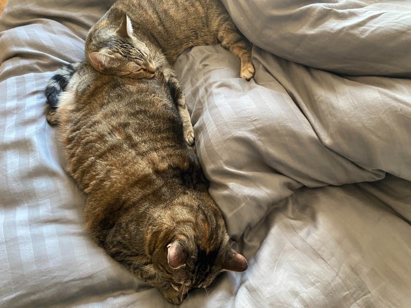 I’ve certainly worked with many patients who are quick to be described as upset when their owner leaves for a trip, and behave differently upon return. My own cats are much like this—hiding when they see the travel bags come out, and not sleeping in their normal spots. Just as I’m heading out the door, Pancake is notorious for doing a “you can’t touch me” and sitting just under the kitchen table, just out of reach. Whereas Tiller retreats to under the bed. On a normal day, they’d simply be asleep on the sofa, and the bed, respectively. So, certainly, they exhibit some mild forms of anxiety, though not enough to be classed as pathological.
