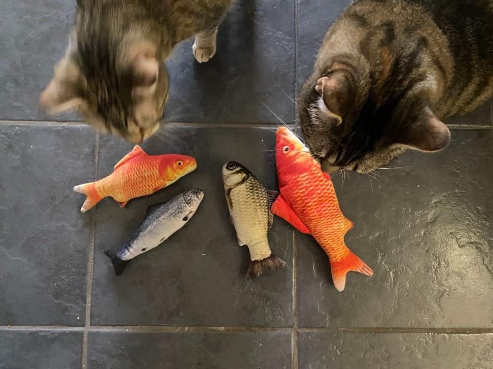 Tiller started life with a small slice of stuffed pizza and now has a series of stuffed fish toys that she routinely rounds up every night, to leave in various positions: grouped outside the bedroom; clustered at the bottom of the stairs, sometimes placed neatly in my shoes. It was a bit disconcerting the first few times, as I wondered if they were a vague cat threat (more food or you’ll be sleeping with the fishes!); so far, nothing seems to have come of it. Colloquially, when Tiller starts rounding up the fish in the house, we now say she is off “fishing” and leave it at that!