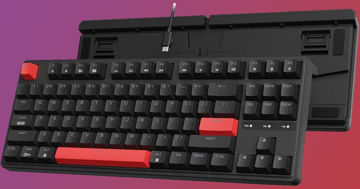 For the money, this is a stunningly well-equipped keyboard, with a pleasant and surprisingly mature black and red colour scheme, gasket-mounted mechanical switches of the red variety (for soft and linear mechanical action), and QMK/VIA support for reprogramming.